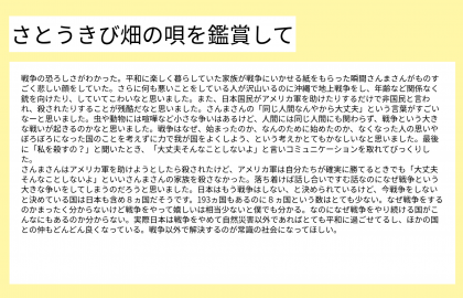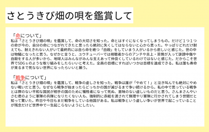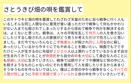 総合の学習では,平和学習の一環として,さとうきび畑の唄を鑑賞しました。子どもたちが感じた想いを振り返っています。ぜひ,見てください。