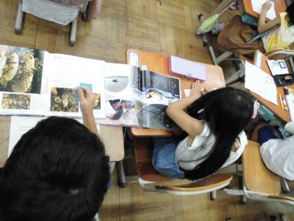 「くちばし」の学習でクイズの作り方を学び、自分がびっくりした生き物の部分についてクイズを作りました。クイズにするヒントを探しながら問いと答えのあるクイズを作りました。クイズづくりの前には、いろいろな本を読み、好きな動物やびっくりする生き物を選びました。本を読んだりクイズを作ったり音読をしたりと、進んで学習に取り組めていてよかったです。