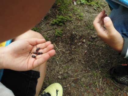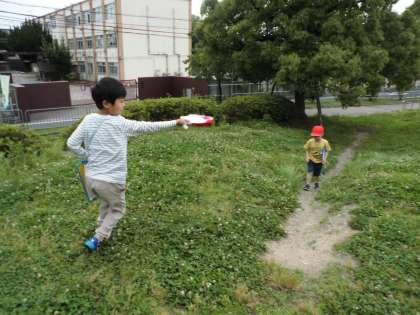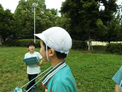 上桂公園へ夏みつけに出かけました。緑の葉っぱや蝶,バッタやオオバコ,タンポポの綿毛などいろいろ見つけていました。春と違って桜の花がなくなり、葉っぱになっていることにも気づいていました。