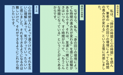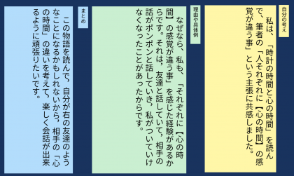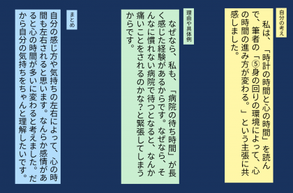 学習のまとめを行いました。筆者の主張に対して,自分はどのように考えたのかまとめました。筆者の主張に対して自分のどのような経験から共感できるか考えたり,この単元の学習を通して,これからの生活にどのように生かすことができるか考えたりしました。