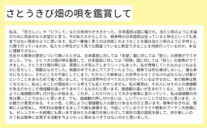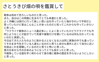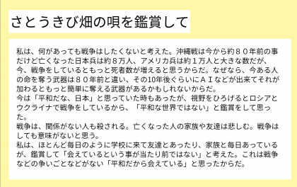 映像を通して、戦争の悲惨さを知るとともに、この世界から戦争がなくなってほしいという気持ちをより強くもつことができたようです。