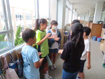フレンドリータイムの当日。朝休みや中間休みにも、みんなで集まって最後の確認をしていました。グループによっては、実際に自分たちがそのゲームをやって、みんなが楽しめるのかを確かめていました。