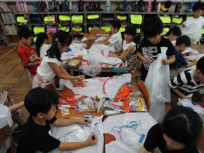 図工の時間にポンチョを作りました。自分が着たいなと思うポンチョを考えながら切り方や飾りを工夫して作りました。楽しんで作り、お互いに見せ合って「見て!見て!」コールでした。