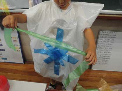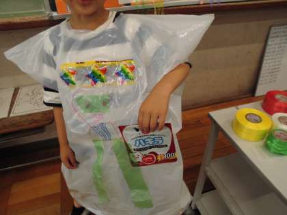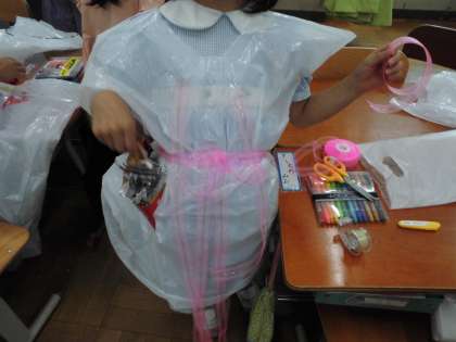 実際に着ながら作る子が多かったです。背中にも飾りをつけたりベルトを付けたりと、アレンジを楽しんで活動しました。みんなすてきなオリジナルポンチョが完成しました。(まだ続きをしたいと休み時間に作っている子もいます。)