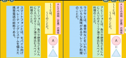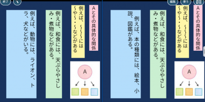 「Aとその具体例の関係」や「Aとその説明の関係」など、例を参考に自分のもっている情報を関連付けた文章を考えました。