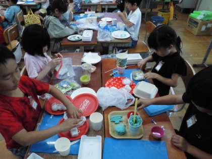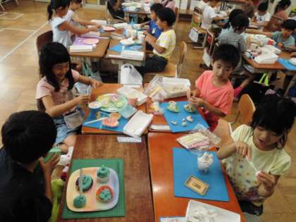 食べたいごちそうを思い浮かべながら楽しくつくりました。お寿司、ピザ、ステーキ、パフェ、だんご、ケーキなどたくさんの食べたいものを工夫して作っていました。模様を付けたり紐をねじったりくるくるまいたり薄く延ばして重ねたりはさんだり……。にぎやかに楽しい雰囲気で作り進めました。
