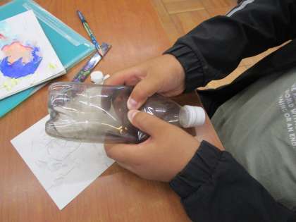 ペットボトルを使って押す実験と、注射器の先にキャップをつけて力を加える実験を行いました。