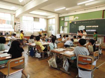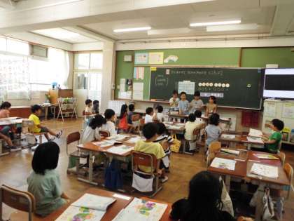 「かたつむり」を楽しく歌っていると、リズムうちを始めるこどもたち。いろいろな既習のリズムを歌に合わせてうち、友達と楽しみました。グループでリズム打ちをする順番やどんなリズムを打つのかを相談し、練習をしました。自分が打ちたいリズムを決めて歌に合わせて箔を感じながら打ち、お互いに見合いっこをしました。打ち方やリズム感のよさを見つけ合いました。