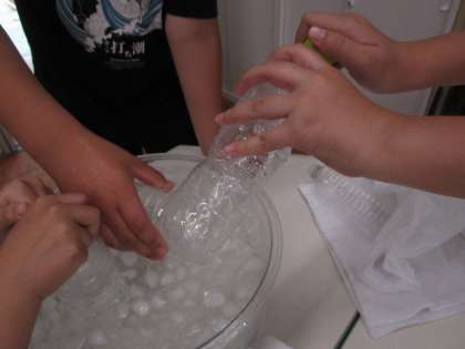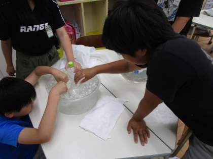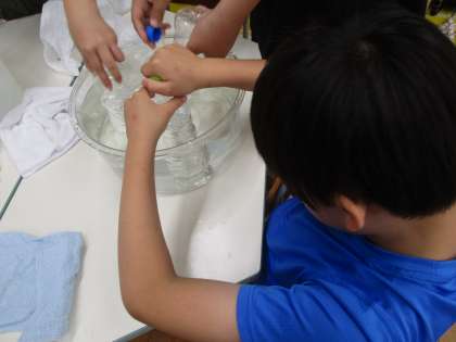 ペットボトルに閉じ込めた空気を湯と氷水につける実験をしました。