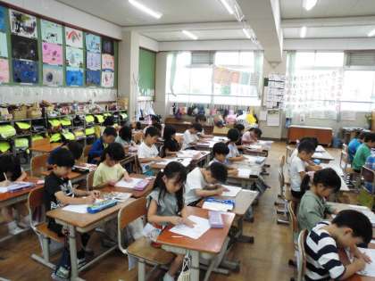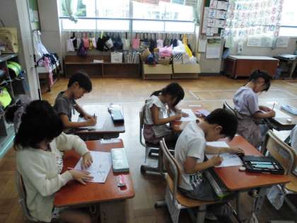 最後の平仮名学習。「を」でした。いつも言葉集めをしますが、今日は言葉集めが……。文の中で使う「を」なので文をつくろう!と話し合いました。