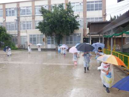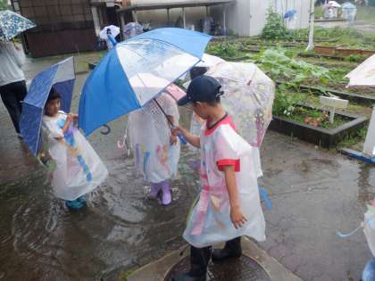 たくさんの水たまり興奮気味の子ども達。「雨が落ちたら渦巻きみたいなんができたよ。」「晴れの日と違って空が白いなあ。」「見て見て〜川みたいに流れてるで!!」とたくさんの気づきをしていました。