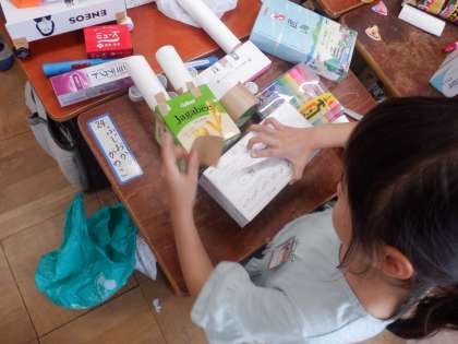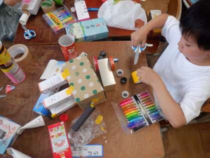 はこを積み重ねたりペットボトルのキャップを使ったりして動物や乗り物など,箱の特徴をとらえ,楽しそうに作っていました。