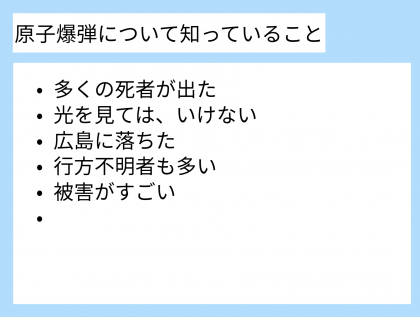 修学旅行に行く前にも、原子爆弾とはどんなものなのか学習しています。言葉は知っていても、仕組みをはじめ、知らないことがほとんどで、その威力の大きさなどに子どもたちはとても驚いていました。