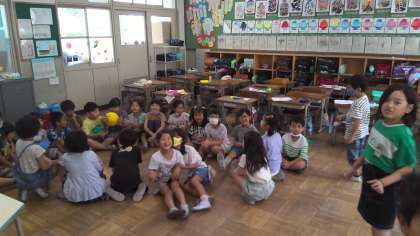 音楽に合わせて、ばくだんとなるボールをテンポよく回して遊びました。
