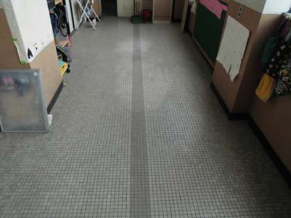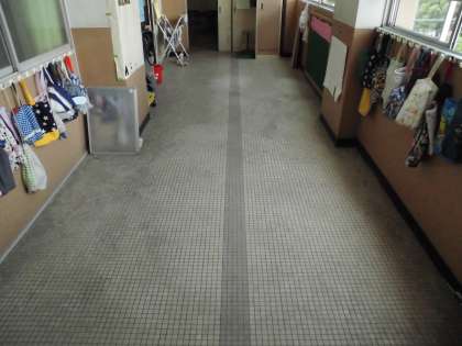 少しずつ汚れが落ちていますね。きれいなろうかに仕上げたいですね。