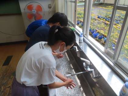 調理実習をスタートする前に、しっかりと手を洗って消毒です。食べ物を作るときには、何より衛生的であることが大切ですね。