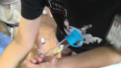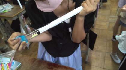 「空気と水」の学習のまとめで、実験道具の中にスポンジで作ったイルカを入れて、空気をおしちぢめてみました。すると、スポンジのイルカが・・・!!