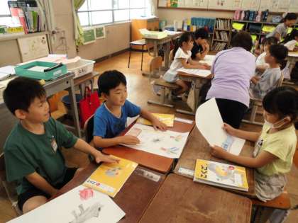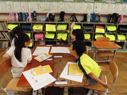 自分の好きなものを友達に紹介し合いました。好きなものをった後に理由を伝えます。友達に伝わるように聞こえる声で話したり皆の顔を見たり絵を見せたりして話しました。聞くほうも友達の顔を見てうなずいたりにこにこしたりして聞くようにしました。そして、グループでは、感想や質問も伝えました。