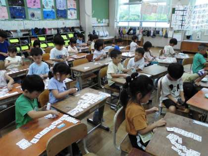 答えが同じになる式をカードを並べて確かめました。並べてみて階段になっている、1番多いのは答えが1など気づいたことを発表し合って確かめました。(後片付けがなかなか大変でした……。何でも練習です。いろいろな並べ方でも取り組んでほしいので、並べ替えをしていってほしいです。そして、カードの扱いも少しずつ上手になっていくと期待しています。)
