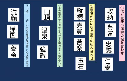 まずは、これまでの復習として、2字の熟語の成り立ちチェックで確かめました。