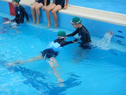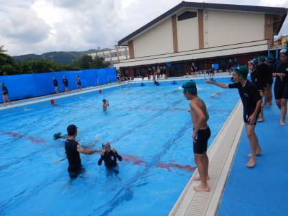 プールサイドからも、声をかけたり、泳げたら一緒に喜んだり…