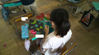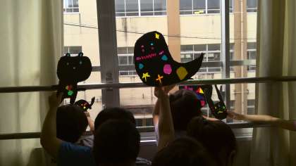 カッターで丸やハート型などを切り抜き、ネオセロハンを貼って、