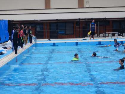 もしもの時、「たすけられるんじゃないか…」と飛び込んでしまい二次災害にあってしまうことを避けるために、近くに浮いているものを近くに投げ浮く練習をしました。