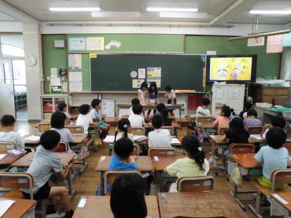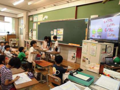係の読聞かせ。毎週3人で協力して読聞かせをみんなにしています。今日は、「へんしんまんざい」です。楽しい言葉遊びの本に面白そうに聞いている子どもたちでした。子どもに人気のへんしんシリーズで知っている子が多かったです。