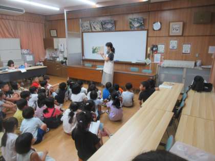 2冊の絵本の読み聞かせをしていただき、子どもたちはお話の世界に入って楽しい時間を過ごしていました。