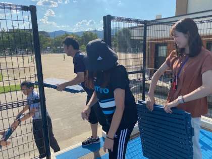 更衣室前のすのこも運びます。狭いところを運ぶので、バケツリレーならぬすのこリレーが始まりました。
