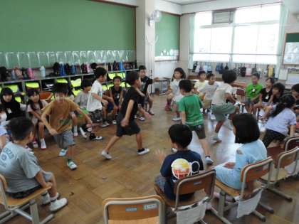 25日は、夏休み明け、みんなで楽しく「夏休みバスケット」をしました。夏休みにしたことをもとに動いたり質問したりして楽しみました。