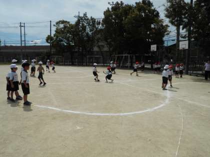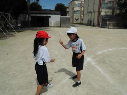 体育の学習で「じんとりあそび」をしました。友達となかよく遊びを楽しみ、1学期にしたリレー遊びでの線の上をしっかり走ることも意識して取り組めました。暑かったですが、休憩をはさみながらいろいろなコースで相手チームとの陣取り遊びを元気に楽しくできました。楽しくできた,仲良くできた,力いっぱい走れたという感想がたくさんだったのが素敵でした。