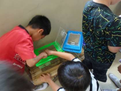 小さな友だちの気持ちになって、気持ちよく住みやすいように草や枯葉を追加したり、えさのトレーを作ったりしました。