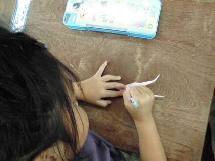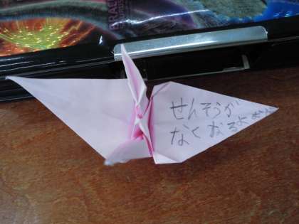 6年生が平和学習の一環として修学旅行で広島へ行きます。その時に折り鶴を捧げるのに1年生も参加しました。6年生が折った鶴の羽にメッセージを書きました。「戦争はしない。」「ニコニコを増やせるようにする。」「なかよくする。」などの意見が出て、一人ひとりが自分で考えて書きました。
