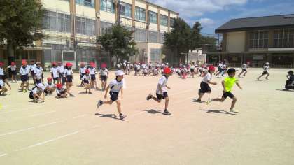 リレーの学習では、まずスタートダッシュの力をつけるための練習を行いました。座ってからのスタートや後ろ向きのスタートなどいつもとは違うスタートの仕方に楽しみながら取り組んでいました。