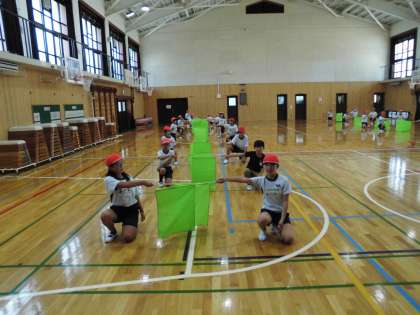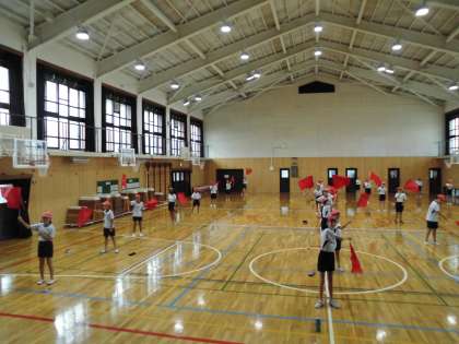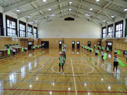 先週は体育館でフラッグの振り方を確認し、今週からは運動場に出て隊形を決めたり隊形移動の練習をしたりしています。