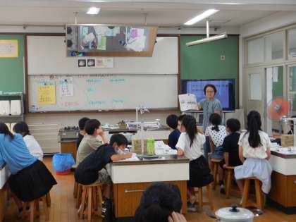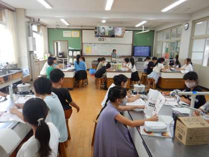 次からの実習のため、家庭科室で行いました。