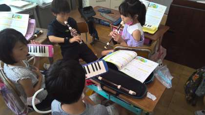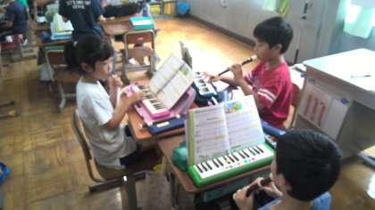 音楽家の学習では、「ゆかいな木きん」の曲を鍵盤ハーモニカとリコーダーと木琴のパートに分かれて演奏練習を進めています。お互いの音を聞きながら、音を合わせて練習していました。