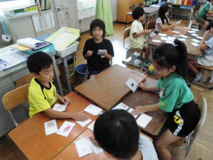 作ったかるたをみんなで楽しみました。みんなとっても楽しそうに活動していました。かたかなにどんどん親しんでほしいです。
