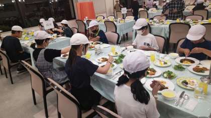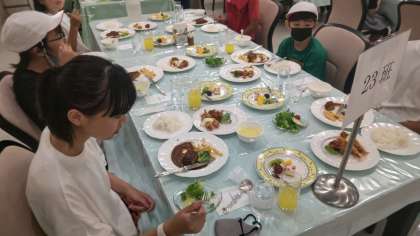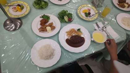 ホテルでは、ハンバーグや唐揚げ、エビフライなど、美味しそうな夕食をいただきました。