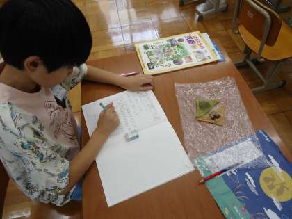 この日は、実際に生八つ橋を見て触って、調べ学習をしました。