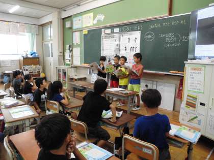 みんなで楽しんだ後は、グループでよびかけとこたえを考えて相談して歌いました。歌詞を変えたり声の大きさを工夫したり動作を入れたり呼掛け役になる順番を考えたりと、各グループで相談して歌いたい歌い方で歌いました。自分が歌いたい思いをもって歌えるといいなと思います。