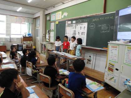「やまびこごっこ」をみんなで楽しく歌いました。最初は大声で怒鳴っている子がいましたが、どんな声が聞きやすいかどんな感じで歌いたいかを話し合って歌い方にも気を付けて歌い始める子が出てきました。