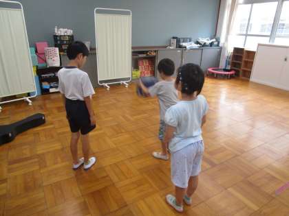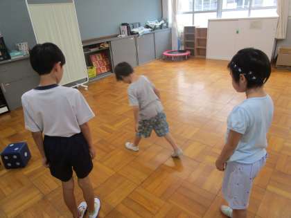 1年生がプレイルームで大きなさいころを見つけました。