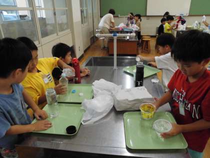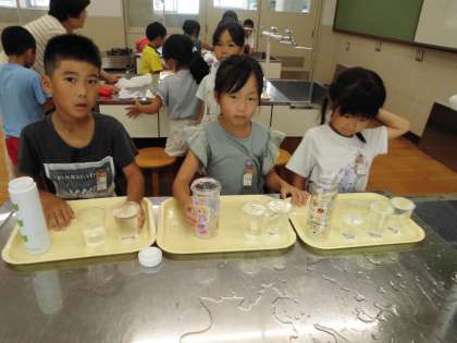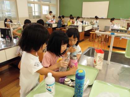 かさくらべしました。入れ物が2つのとき3つのとき、どれだけ多いかを比べるときと比べ方を考えて活動しました。班で協力して活動しました。
