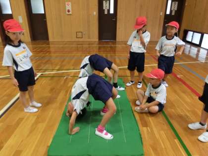 こんなにできるよ!と、高いブリッジを紹介しあっていました。お互いにいいところを見合って、どうしたらできるのと聞いて教えてもらい、上手になっています。すてきです。