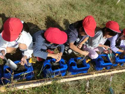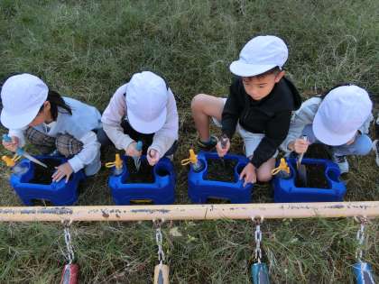 チューリップの球根を植えるのに、土づくりをしました。苦土石灰や肥料、新しい土を入れて混ぜました。ふかふかの土になりました。来週、球根を観察して植えます。球根は、自分が咲かせたい色を選んでいます。楽しみにしている子が多いです。