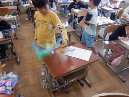 友だちの作品のいいところを見つけるのが大好きな子どもたちです。ひらひらゆらして作品の面白さを感じてい巻いた。