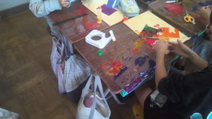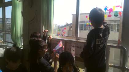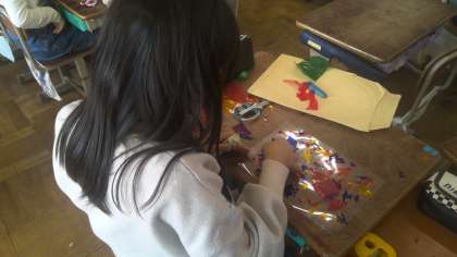 セロハンの形や色の組み合わせを工夫し、作品づくりを楽しみました。「ここ、色を重ねたらきれいになった!」「見て!丸めてみたらまた違った感じでいい!」など、楽しそうに学習をしていました。