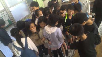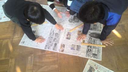 みんなで1平方メートルの新聞紙に乗ってみると・・・なんと18人乗れました。「思ったより広かった!」「もっと乗れると思った」とそれぞれ感想をもったようです。